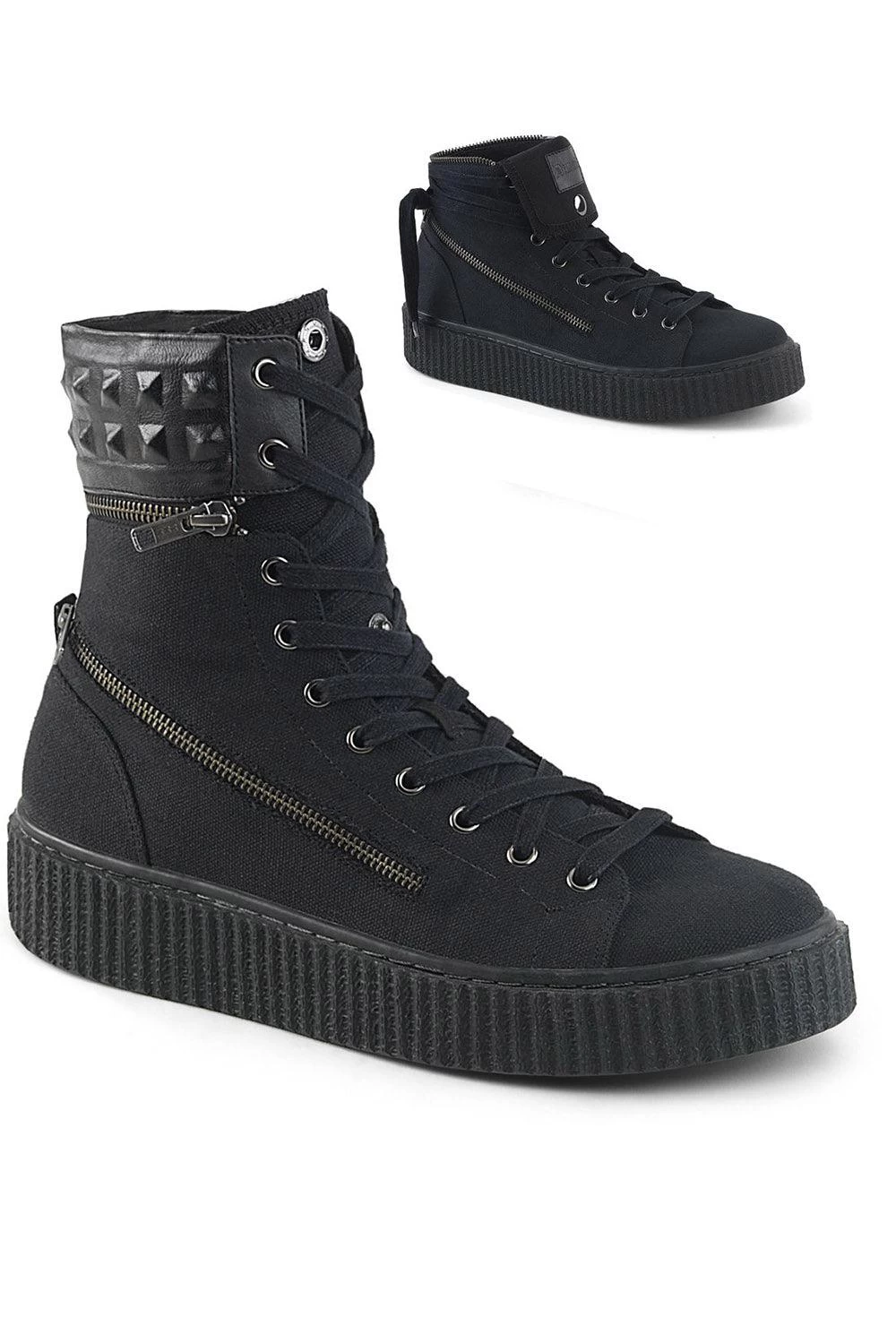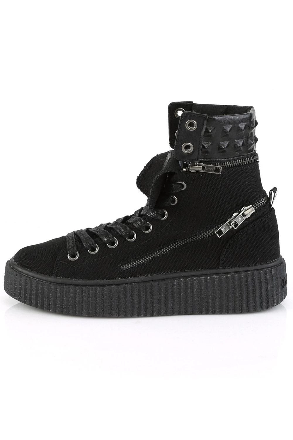 Kick it in these killer high-tops! Constructed of quality black canvas, these sikk sneakers feature metal eyelets, zipper accents, and statement pyramid studs. Zip off the studded top—snap back the tongue to instantly punk-out your outfit. Perfect for consecrating creeps on hallow ground.