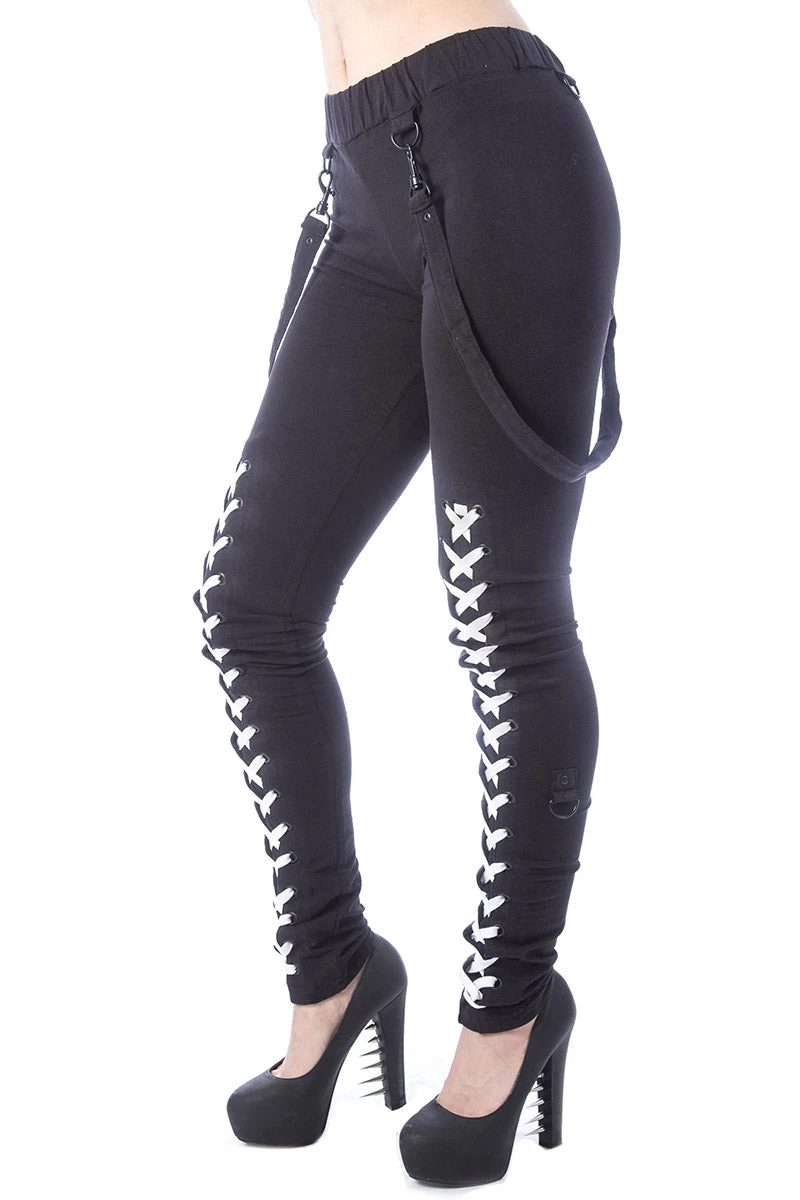 Get tied up in these sinfully sexy corset leggings! Made of a quality cotton blend, these gothic leggings are hot n’ loaded with black metal hardware and accent straps on the calves. Rock the removable bondage straps, made for baddie beauties! Adjust the white corset ties for the purrfect fit.