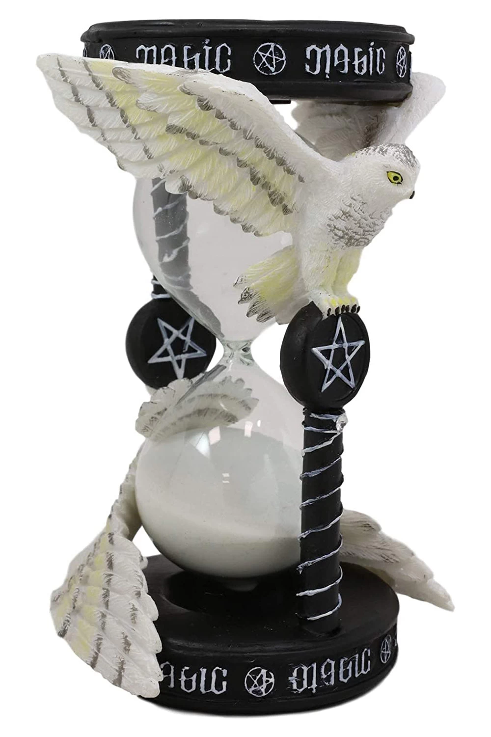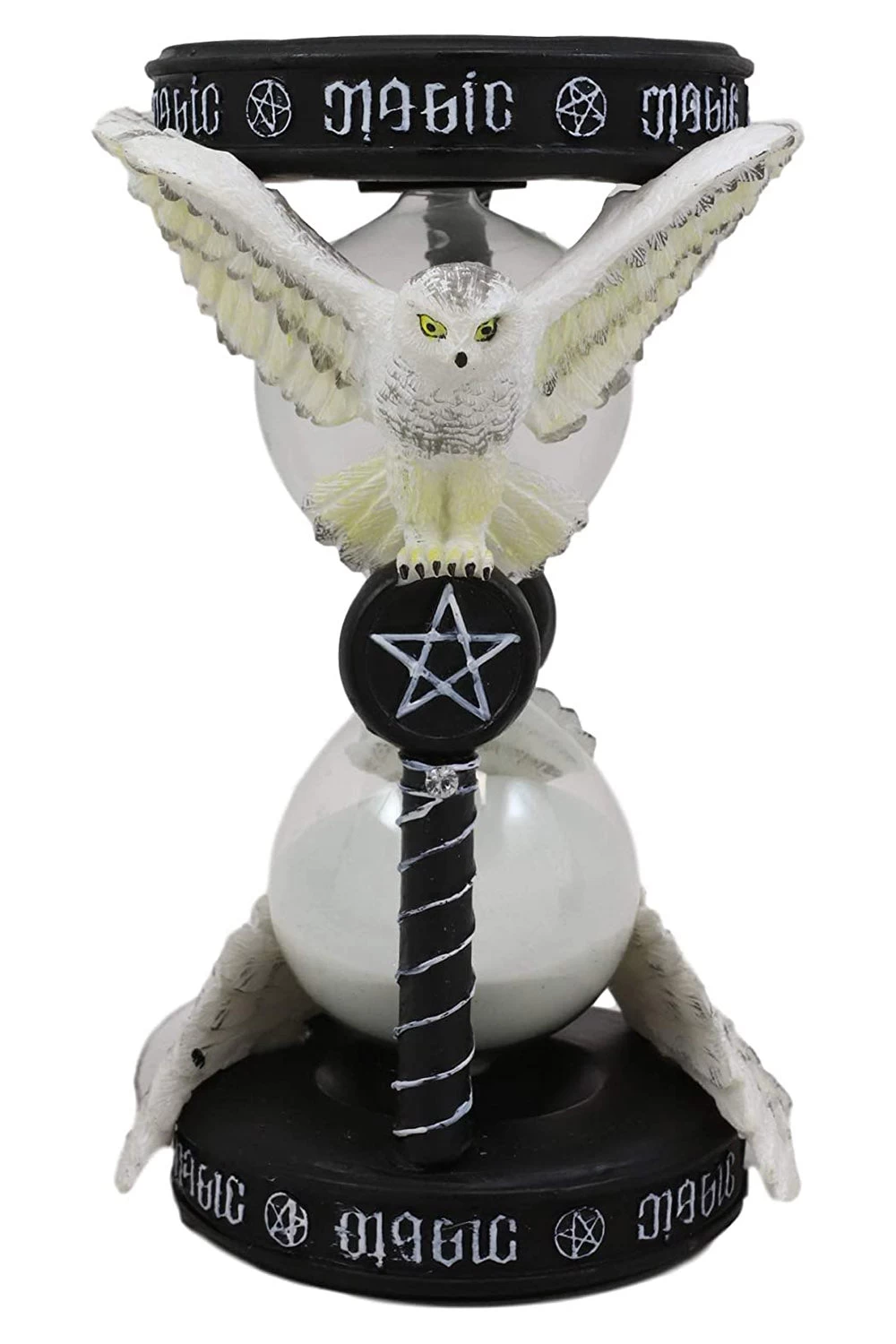 Awaken your sense of time with this beautifully bewitching sand timer! Exquisitely made, this occult sculpture features white owls perched along the glass orbs. Otherworldly symbols and magical lettering charms the columns and supernatural structure. Let the sands of time help you keep track of your reading and crafting time with the every-flowing sand grains cascading to the bottom of this haunting hourglass.