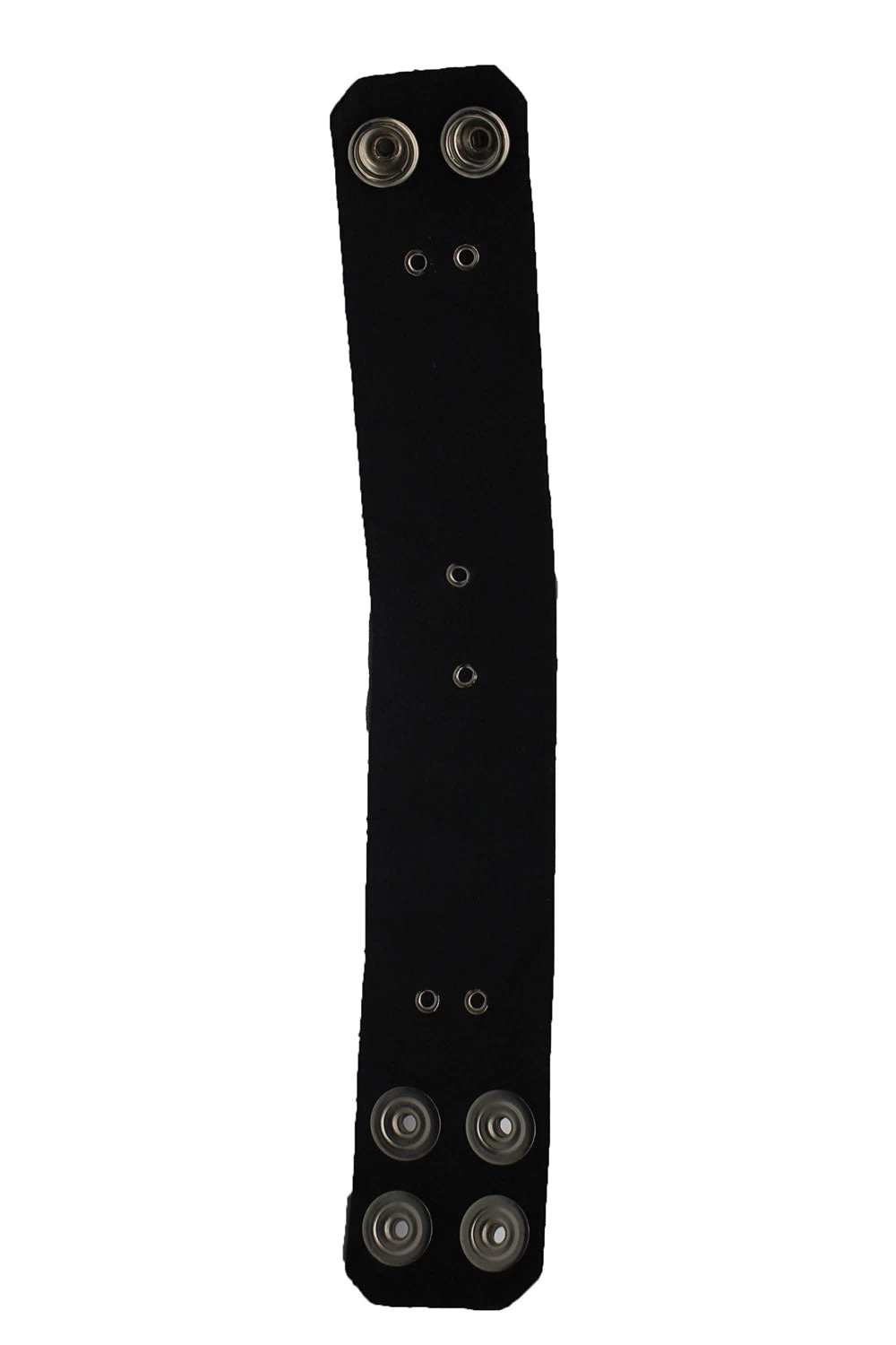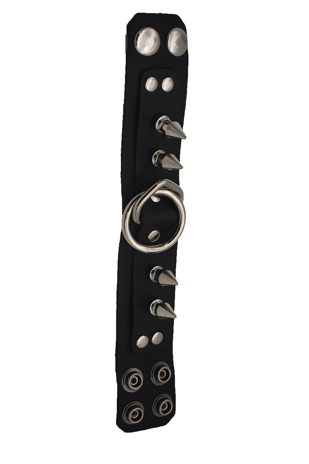 Punk-out your outfit with this black bondage bracelet, made by monsters in the USA! Summon scares with the silver rivet spikes, D-ring, and O-ring hardware. Constructed of genuine leather and finished with a silver snap button closure for a fierce fit.
