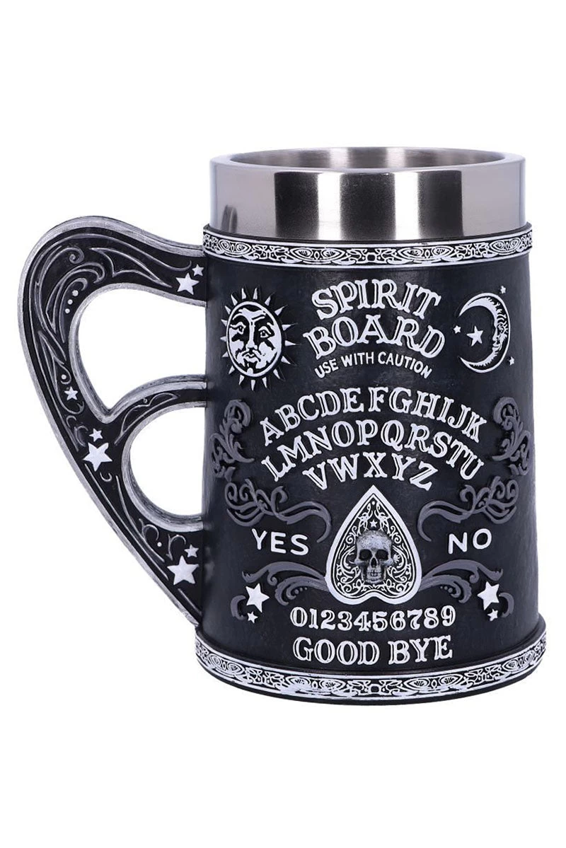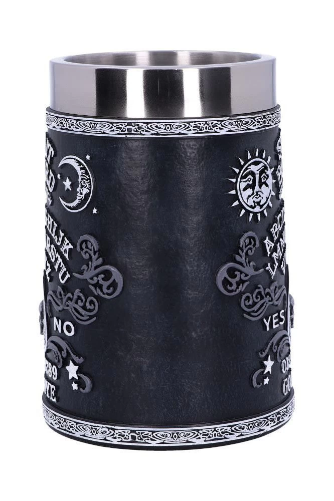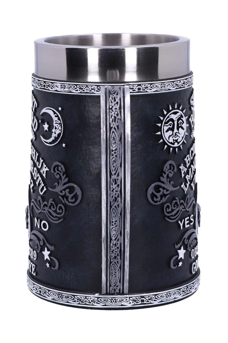 Make a toast to the spirits with this gravely gorgeous mug! Constructed of high-quality resin, this occult cup features ghostly ouija details and ornate designs. A stainless-steel insert inside for easy washing. Complete with a unique planchette handle for haunted hand-holding. Perfect for coffee, tea, liquor, and any other “spirits”.