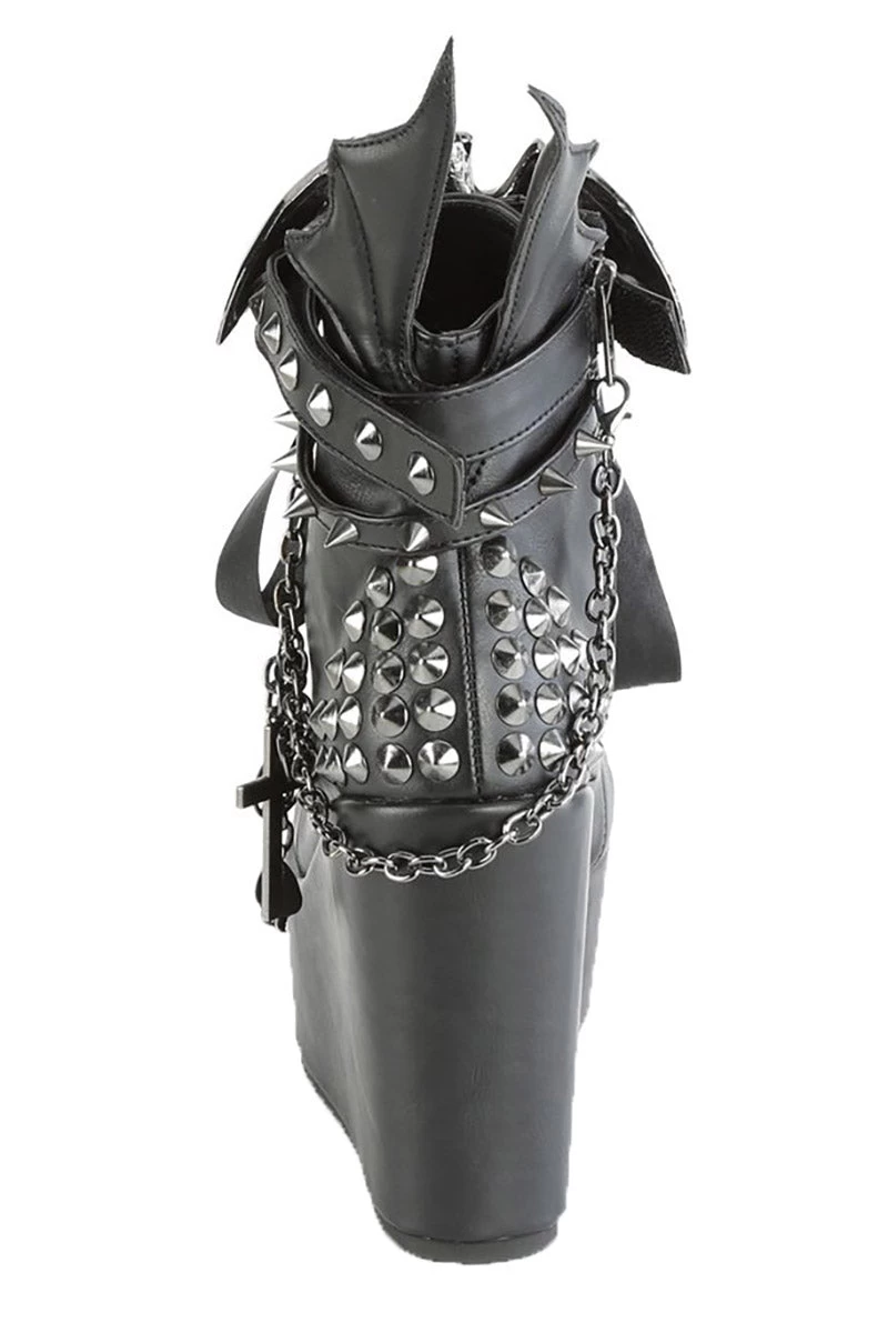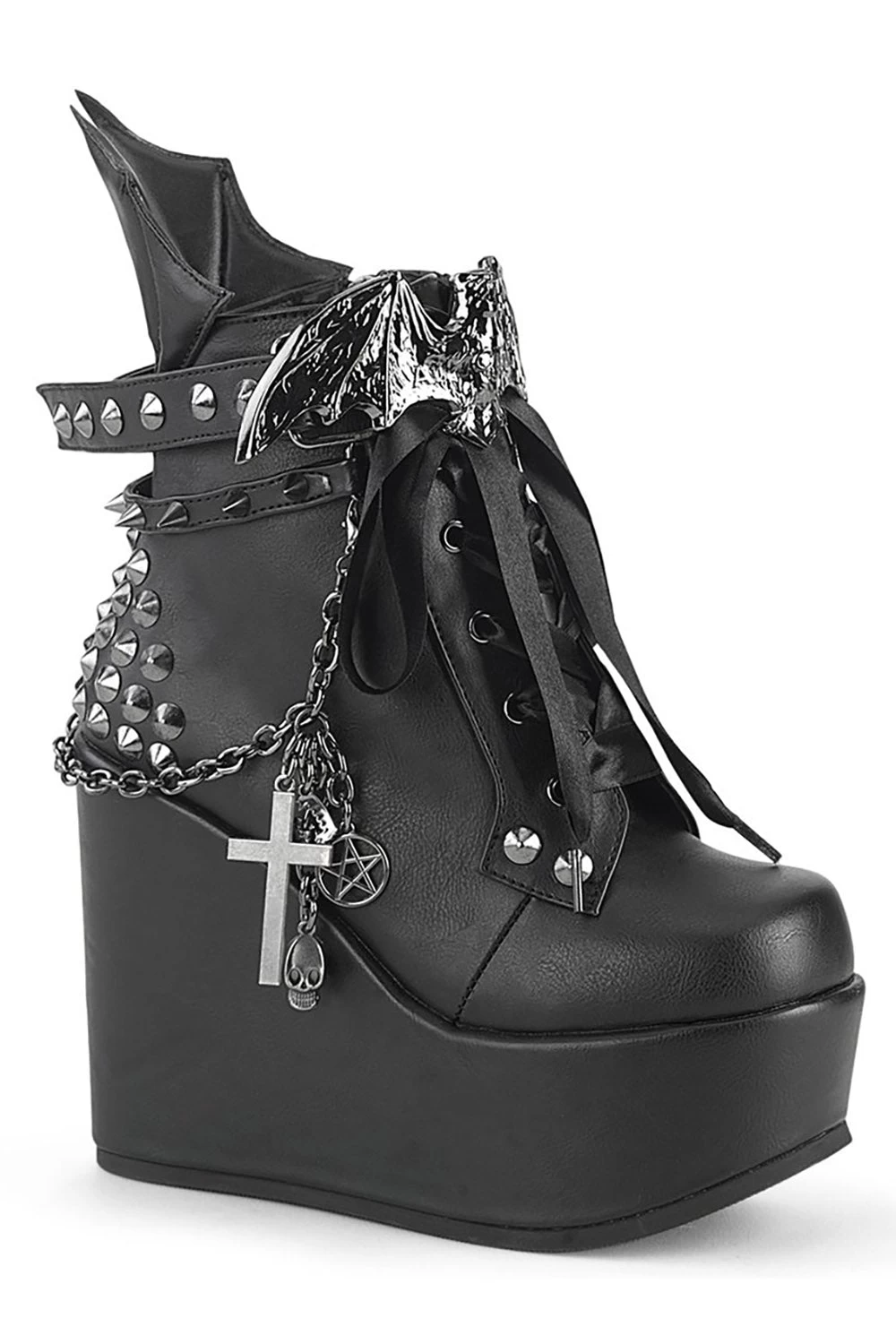 Hex your ex in these bewitching black wedges, haunted with large silver bat ornaments engraved with Demonia detailing. Lace up the romantic ribbon ties, charmed with metal rivet spikes, studs, and adjustable buckle straps. Finished with a statement batwing design on the back, plus a detachable chain complete with gothic charms.
