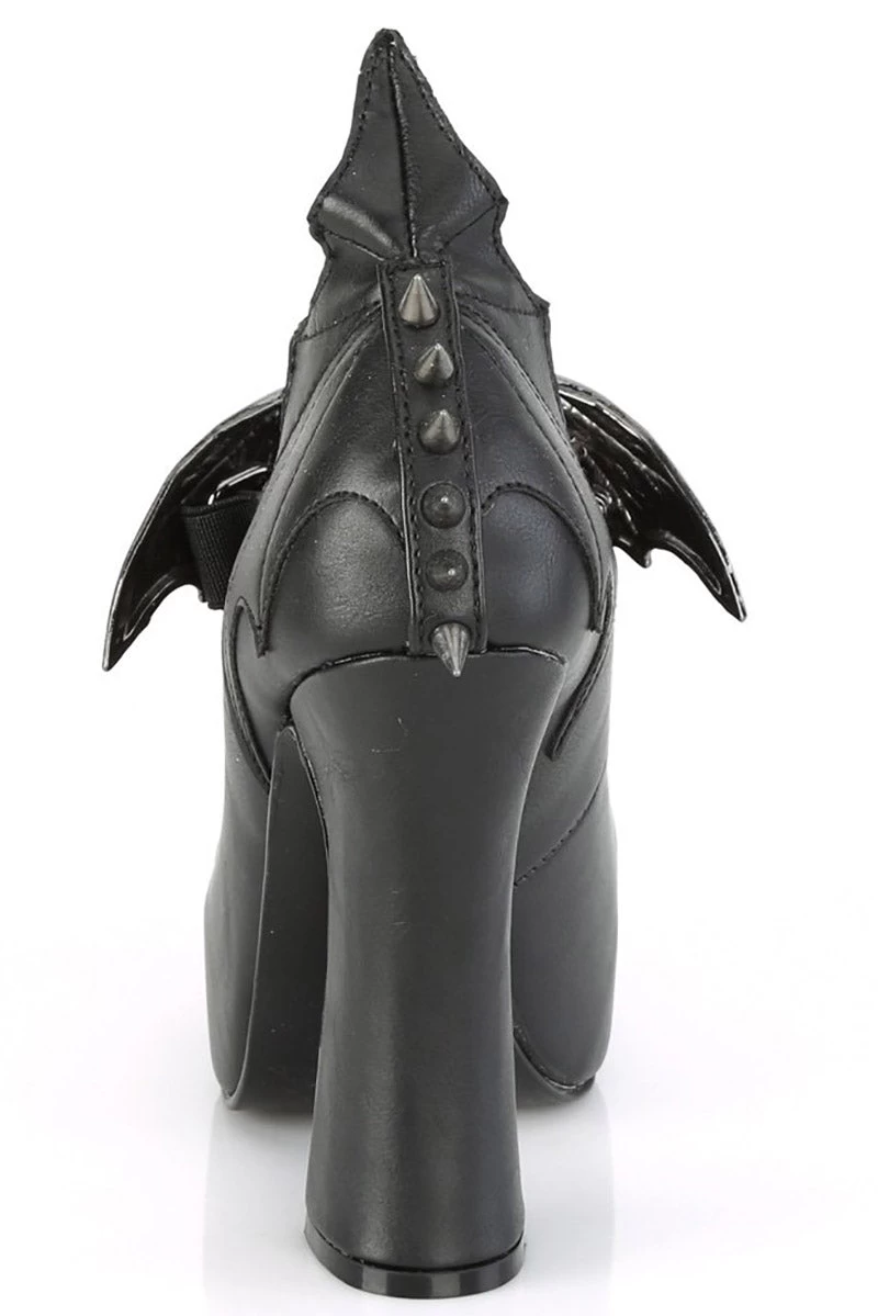 Be your battiest self in these darkling Demonias, constructed for creatures of the night! Bewitch your coven in the concealed platform, metal rivet spikes, and embroidered wing detail. A beautiful silver bat possesses the top the shoe, enchanted with Demonia lettering. Plus a 5 inch heel to give your bootay a helluva lift!
