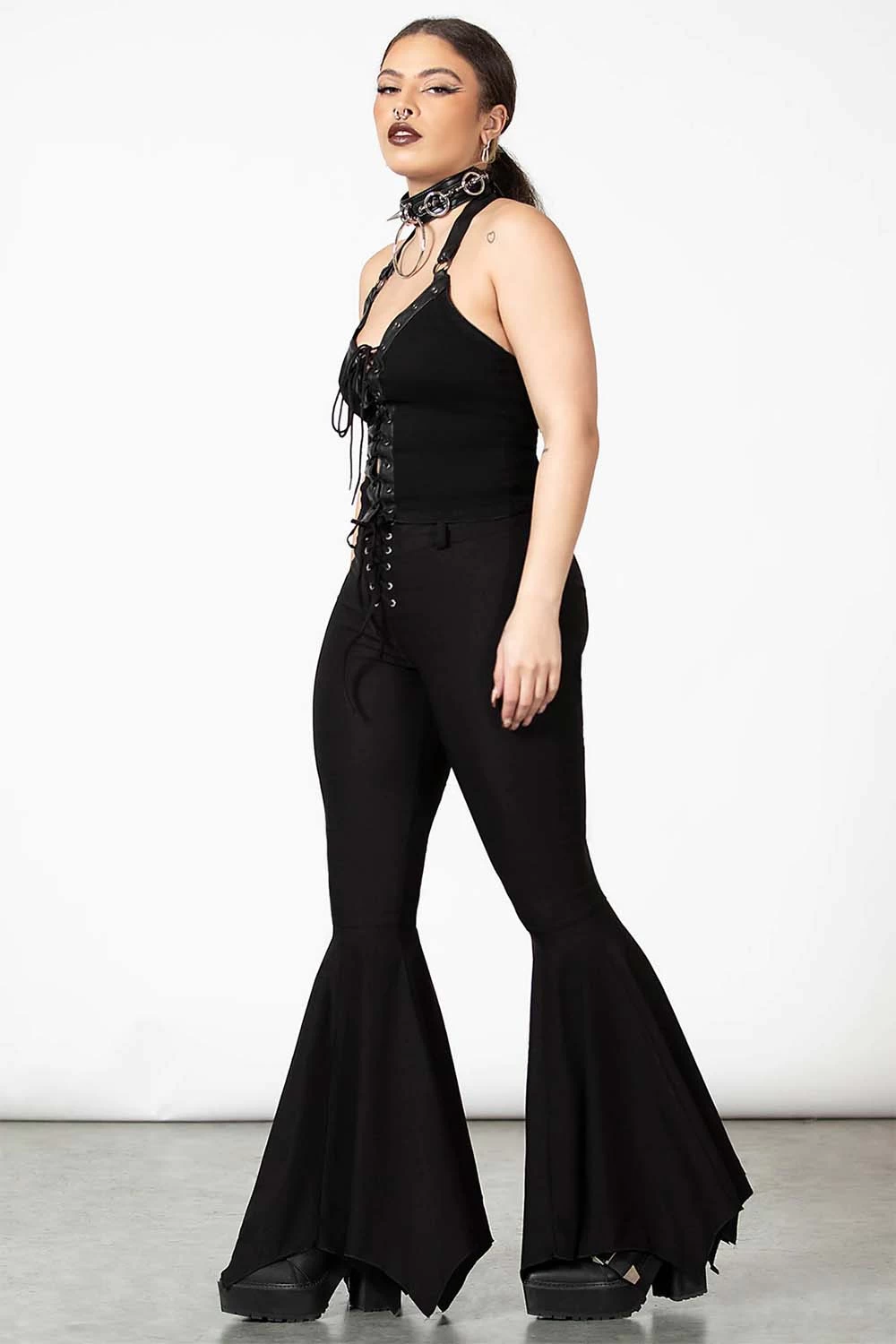 Be ready to take on the night in our ‘Nyte Mystic’ trousers; conjured using a soft-touch fabric which stretches to perfection for a killer body huggin’ fit! Featuring a tie front and extra flare. Perfect for channeling some vintage vamp vibes – easy to wear and goes with anything!