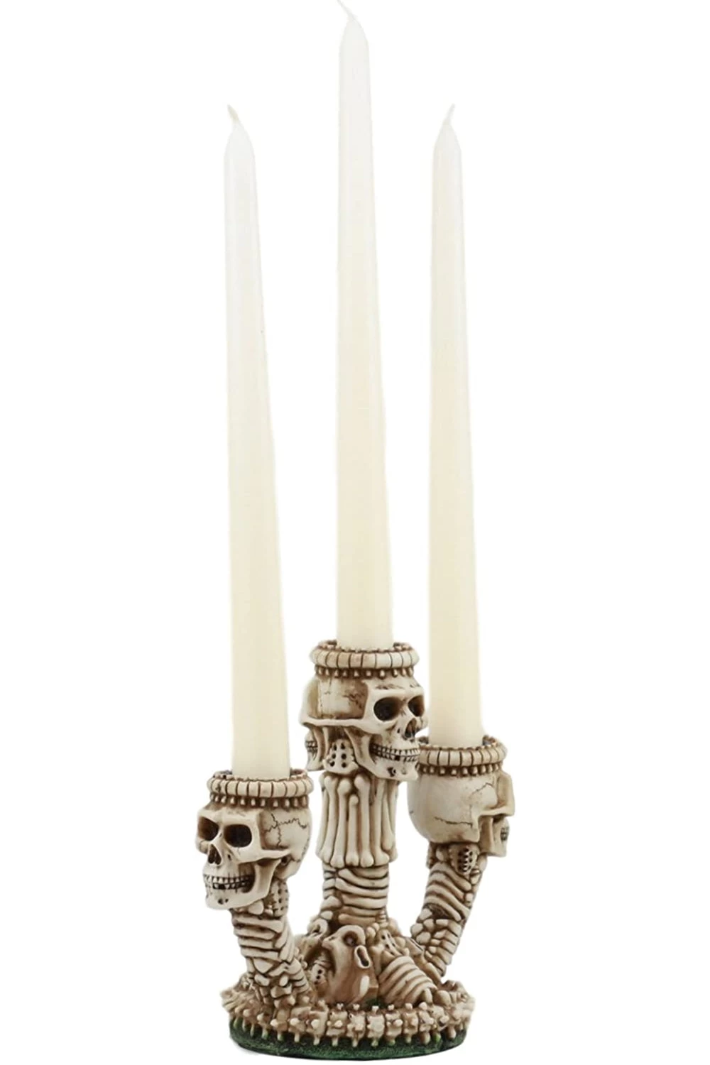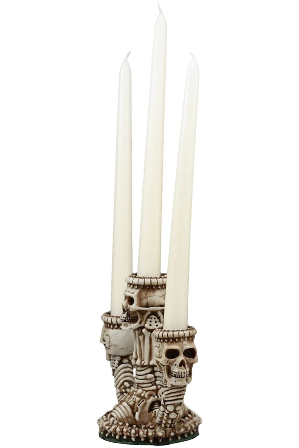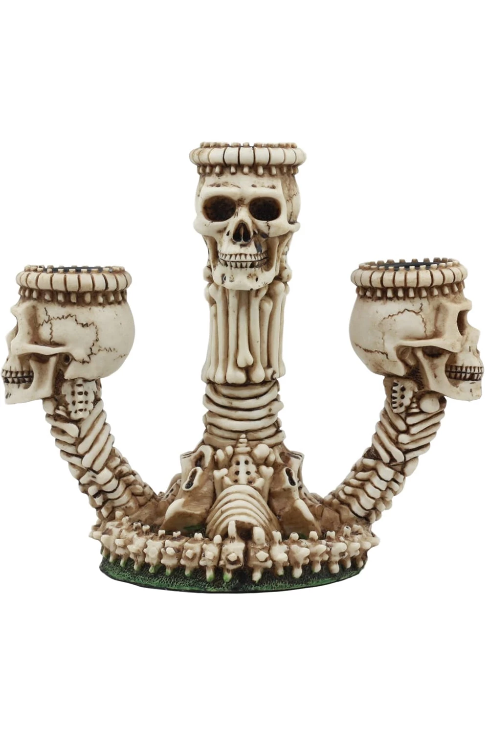 Curse your crypt with this cadaverous candelabra! Made of cold cast resin, this ornate candle holder features three skulls topped with vertebrae crowns. A collection of aged bones haunts the base. Painstakingly painted and textured in design, this ossuary-inspired candle holder is designed to bewitch any room your heathen heart desires.Â