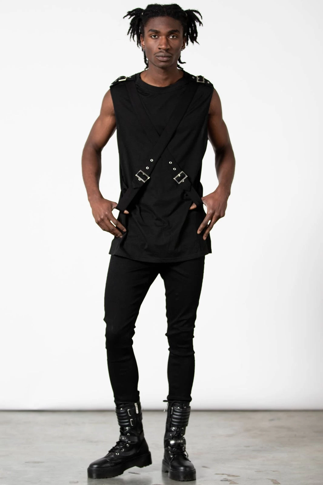 Classic fit vest with some extra length – in a superior smooth jersey fabric with statement straps and buckle accents.