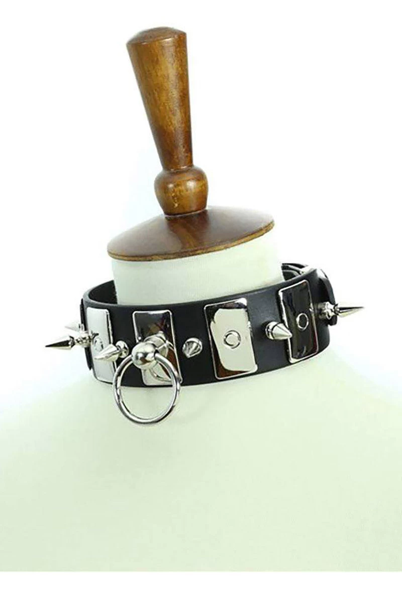 Add some anarchy to your alt clothes with this heavy-duty bondage collar, hot n’ loaded with silver cone spikes and metal plates! Made of deluxe genuine leather, this spiked choker is punk AF with an o-ring in the center and back buckle close.Â