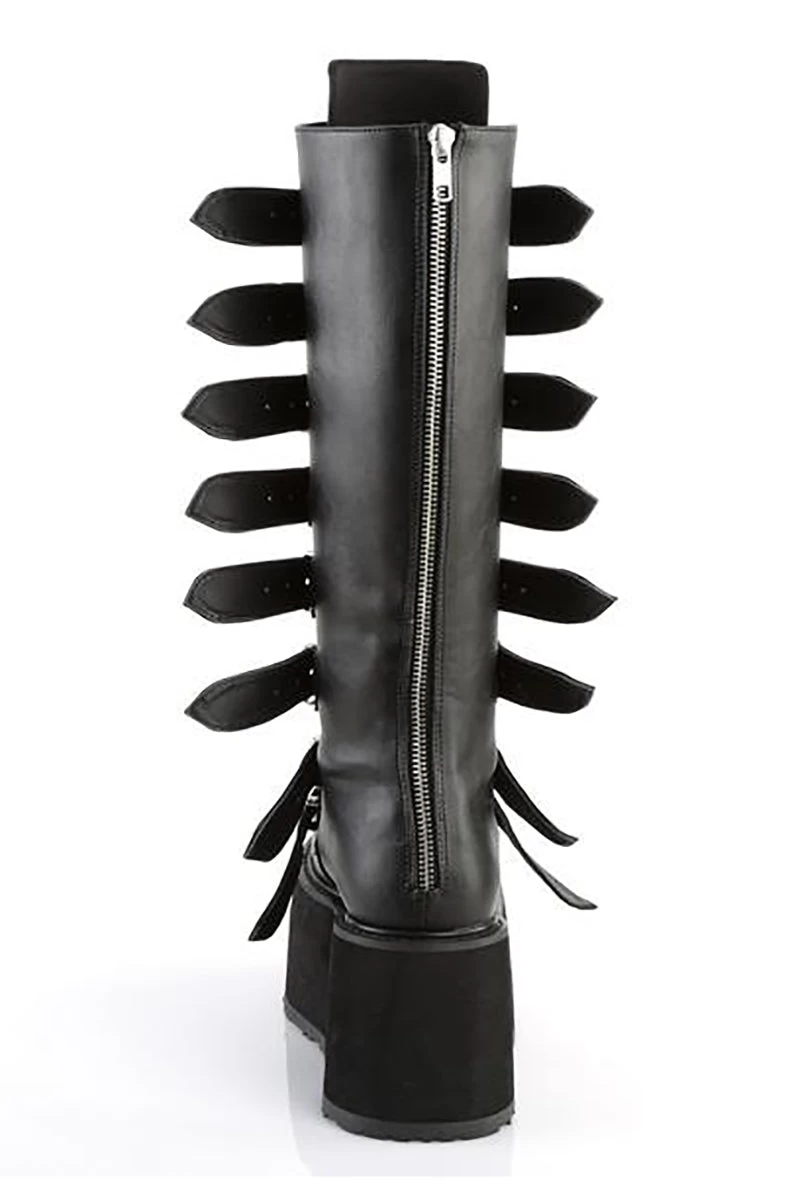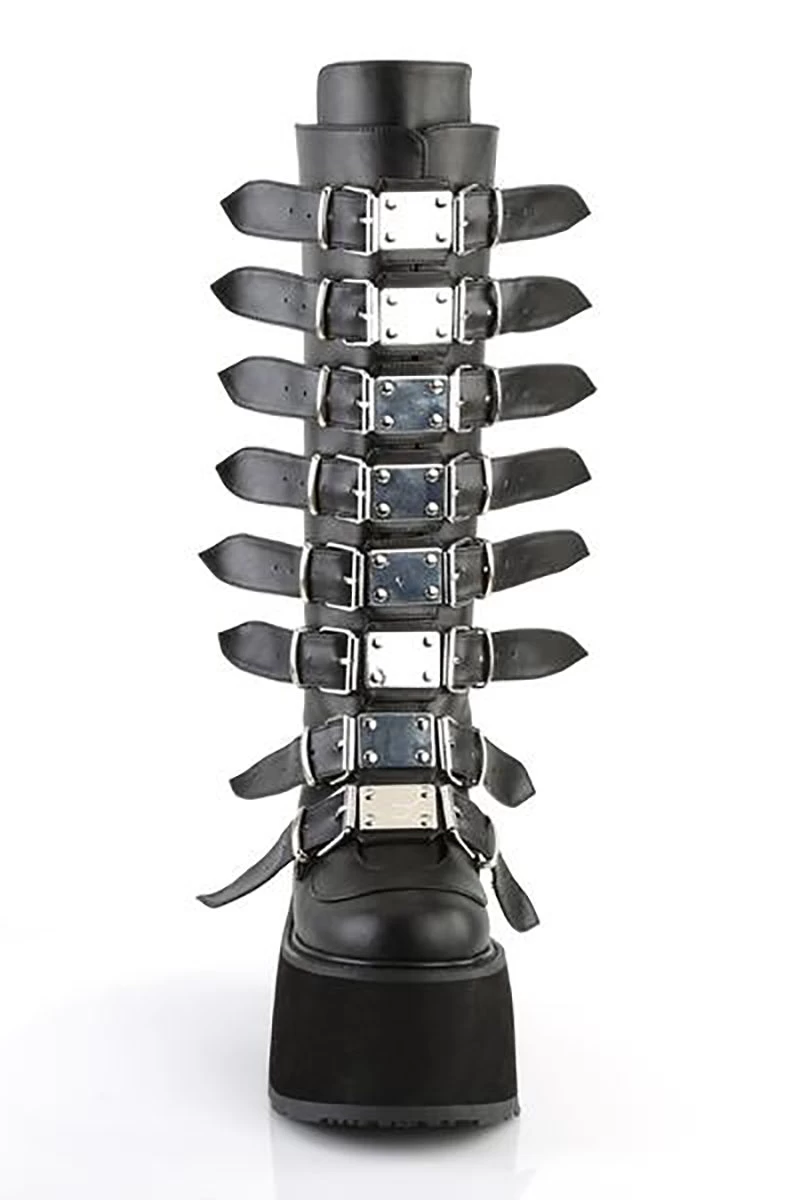 Rule the shadows in these epic goth boots, hot n’ loaded with a legion of accent buckle straps! Possessed with chrome-plated hardware down the front, these hella unique Demonia boots are complete with a 3.5 inch platform to give your badness a boost. Made of quality vegan leather cause creepy cow lives matter!Â