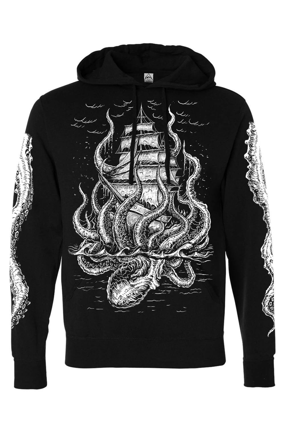 Invoke monsters of the deep with this killer Kraken hoodie! A pirate ship under the Kraken’s attack haunts the front—octopus tentacles possess the sleeves. Make dark waves in the criminally cozy construct, made of sinfully soft cotton! The Kraken takes no prisoners…. and neither do you.