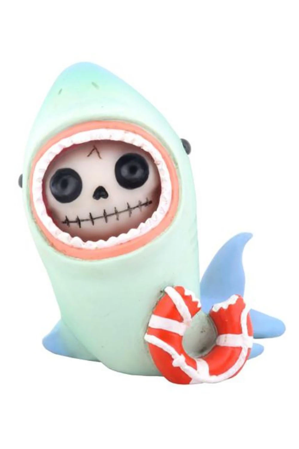 Take a bite outta life with Sharkie the Shark! This spooky shark statue is ready for dark waves with his little life preserver buddy, with a bite in its side! With a skeleton face, stitched smile, and baby blue shark suit, this fiendish fishy is dyying to add some dark waves to your decor!