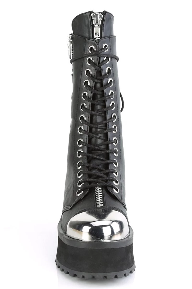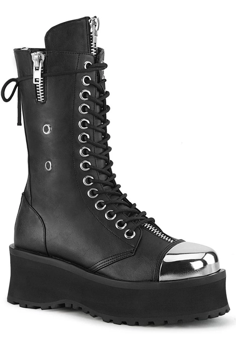 Harness the rage of night in these haunting Demonia boots! Loaded with an arsenal of metal hardware, these gothic combat boots are possessed with a chrome-plated metal toe cap, silver eyelets, and ornamental zippers. Dig their grave in the mid-calf style, back zip closure with lace-up details, and 2 3/4 inch platform. Constructed of quality black vegan leather cause creepy cow lives matter!Â