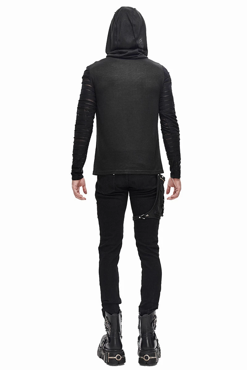 Summon sleepless nights in this killer hooded top, made for creatures nocturnal. Dwell in shadow in the statement hood, hexed with metal hardware. Sinfully soft and sexy, this goth top features knitted mesh sleeves woven with a badass bandage effect. Exposed stitching rips across the chest for extra evil.Â