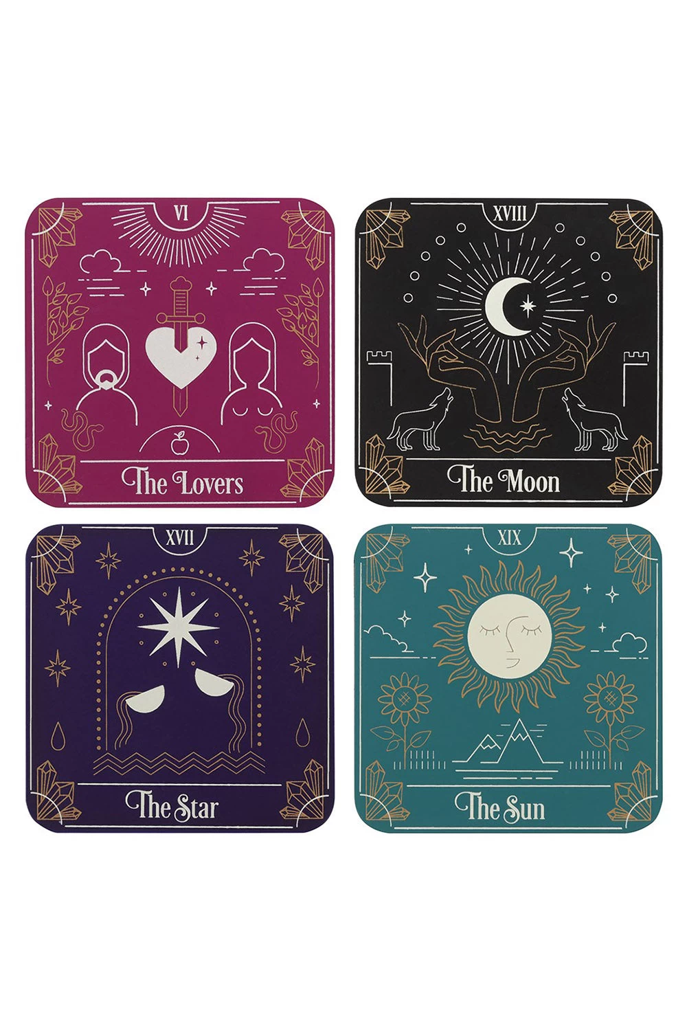 Protect your table from liquid damage with this mystical coater set! Read your fortune every day with the 4 unique tarot card designs, featuring The Sun, The Moon, The Lovers, and The Star. Beautifully designed, this enchanting coaster set is made of eco-friendly MDF wood to please Mother Nature. A cork backing is built into the back of each coaster to prevent any unwanted slipping. Comes in a matching gold-toned holder for keeping your coasters together. Spell yeah!