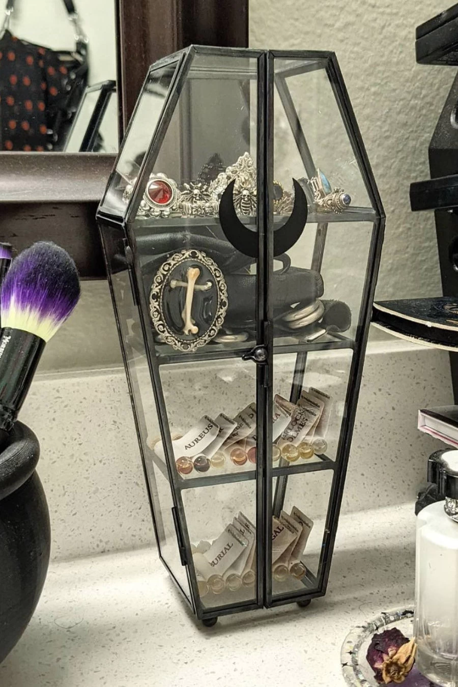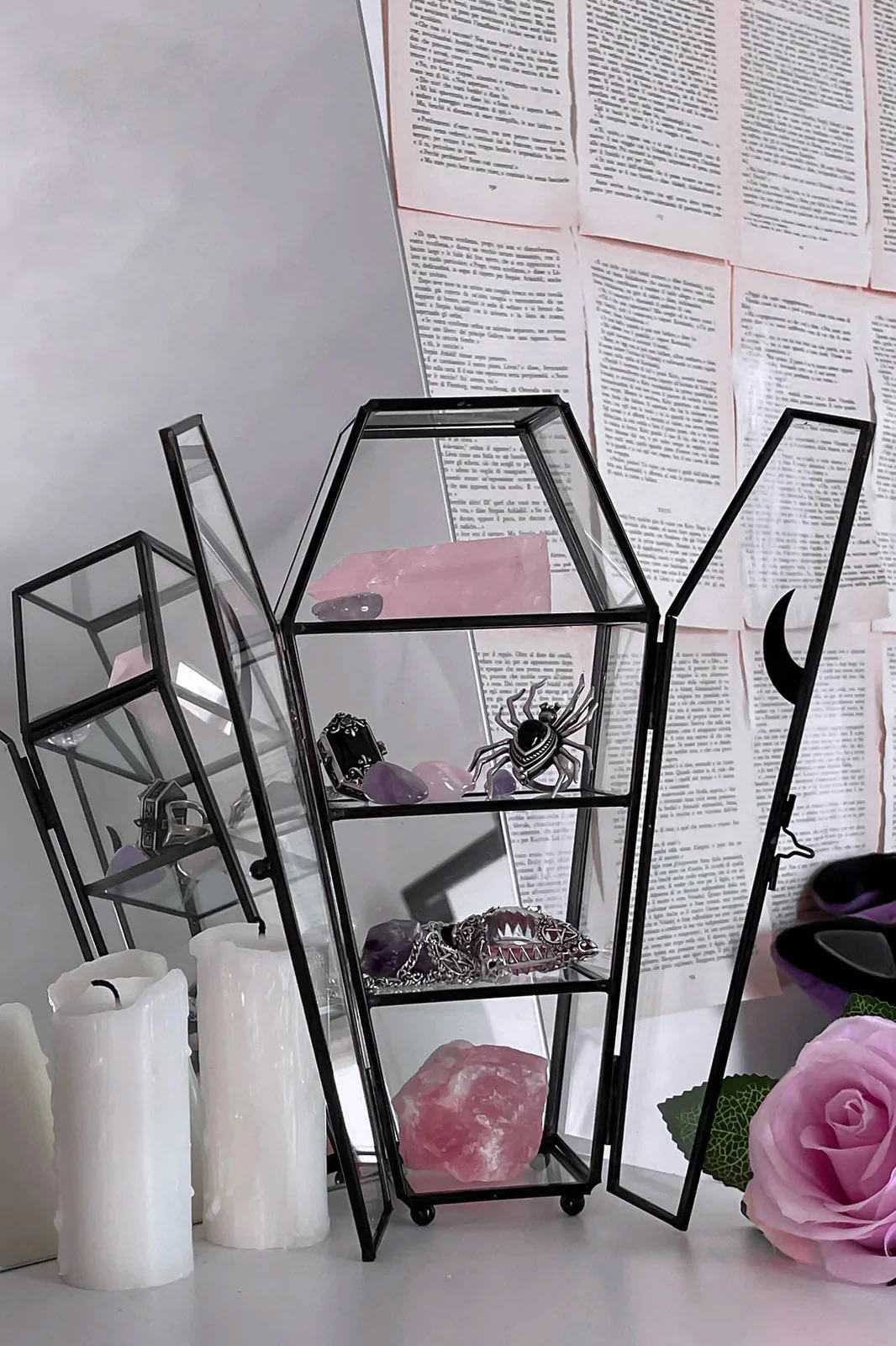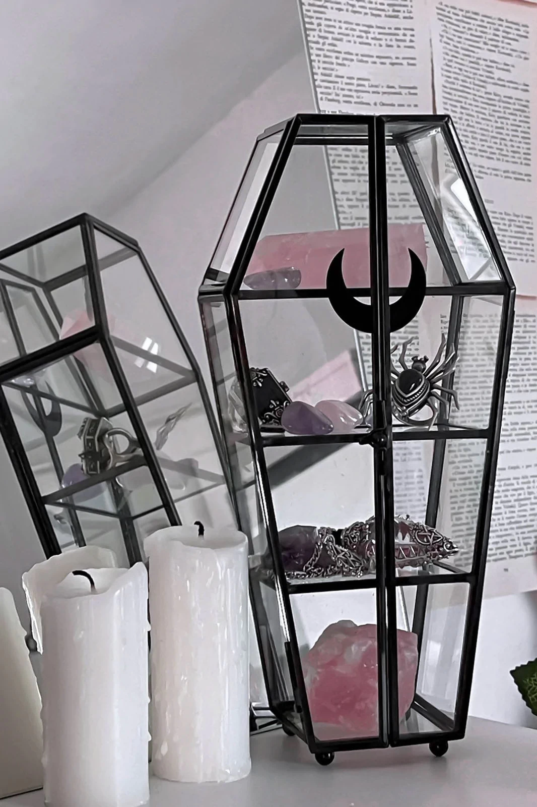 Home sweet haunted home. Add a bit of spooky to your crypt with our ‘Tomb’ display case – complete with double glass lids. Perfect for storing crystals, knick-knacks, keys, secret stuff or whateverz!