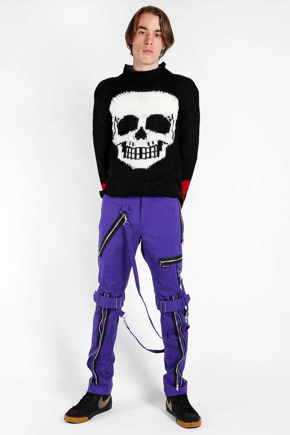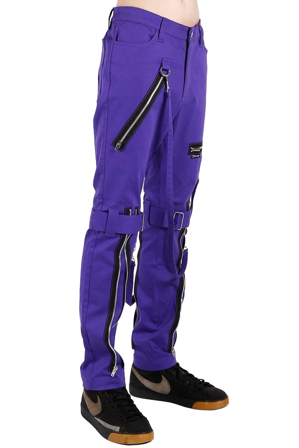 Be the one they won’t forget in these one-of-a-kind Tripp pants. Constructed of bright purple fabric, these punk pants bring the extreme with the contrast strips, D-ring hardware, and zipper details. Zip up the pant legs for a change in fit—remove the bondage straps for a lax look.Â