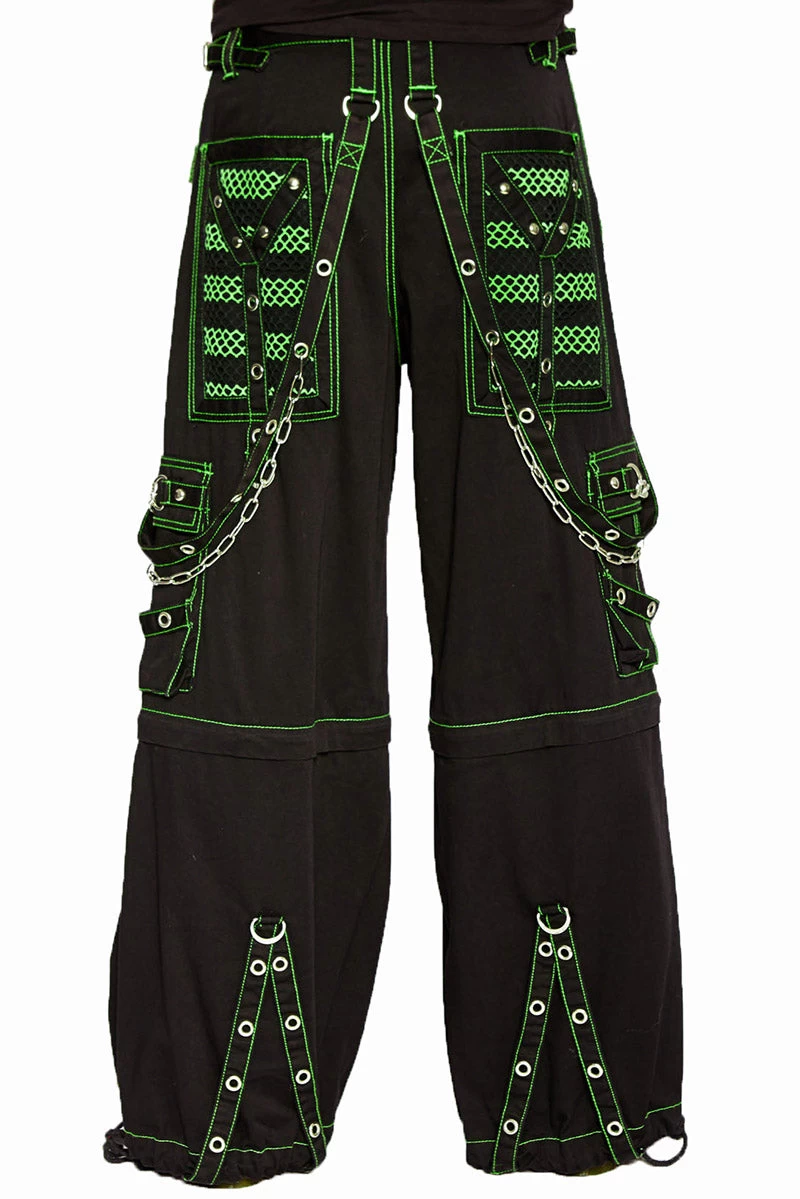 Summon electric feelz in these rad raver pants! Release hell in the bright green accents, silver eyelets, and metal D-ring hardware. Carry your smokes and wallet in the deep netted pockets—rock or remove the statement chains! Features adjustable ankles and a drawstring waist for the perfect fit. Zip off the pants legs to transform these Tripp pants into shorts!Â