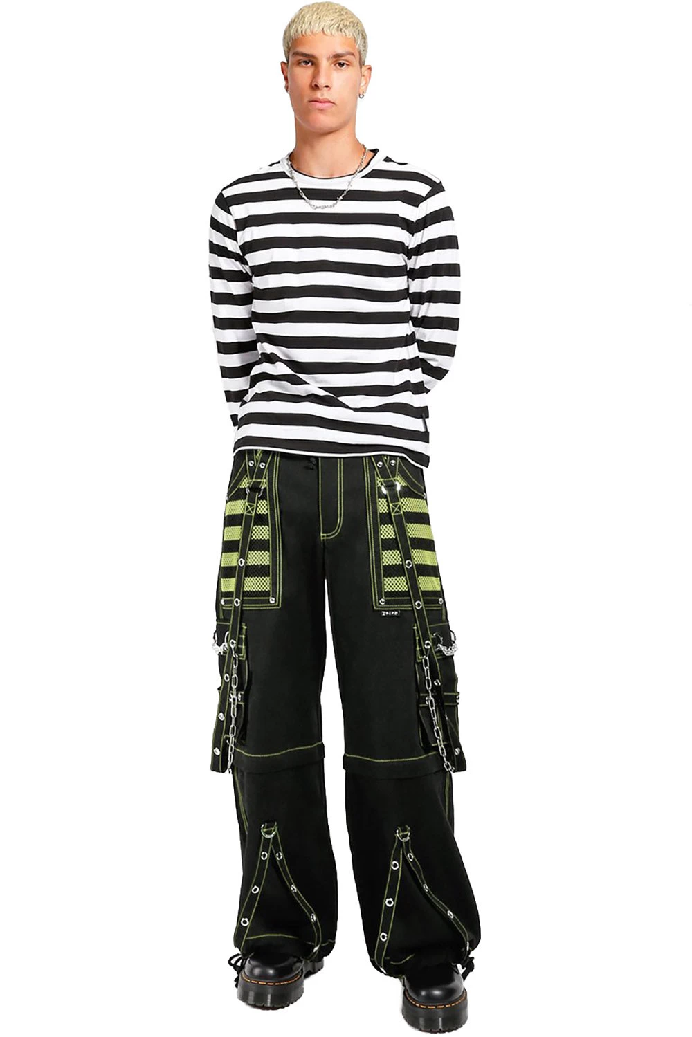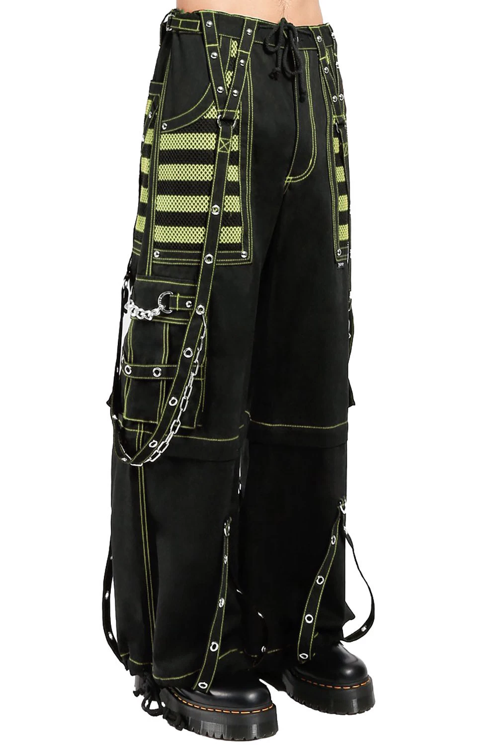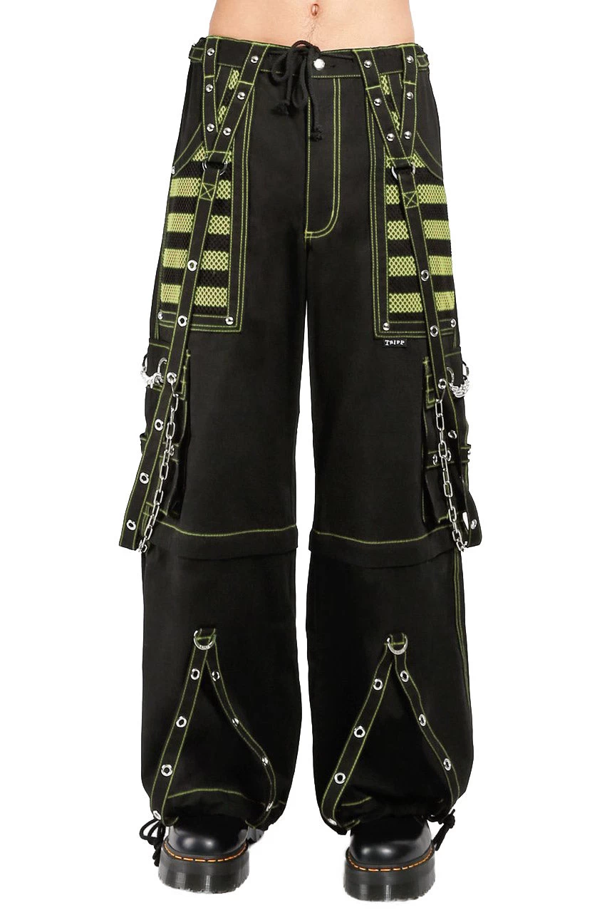 Electrify the night in these baggy black pants, hexed with metal eyelets, silver chains, and detachable bondage straps. Neon yellow stripes and stitching accents possess these statement mall goth pants. Use the drawstring waist and adjustable ankles for a change in fit—zip off the pant legs to transform these Tripp pants into shorts! Finished with deep netted pockets for carrying your punk essentials.Â