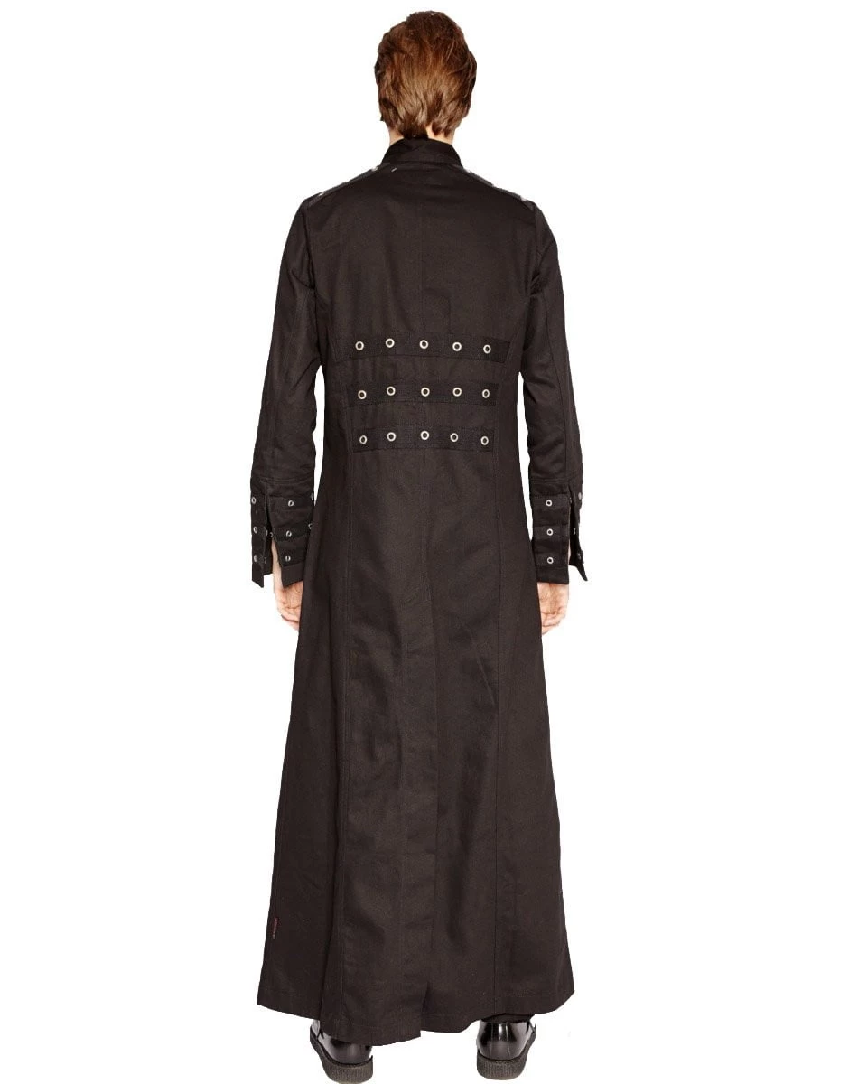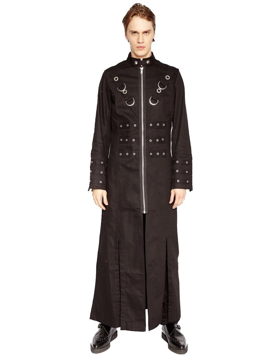 You’re the master of your universe. This ankle length trench coat features silver D-rings, a zip up front, and grommet details on the front, back, and sleeves.