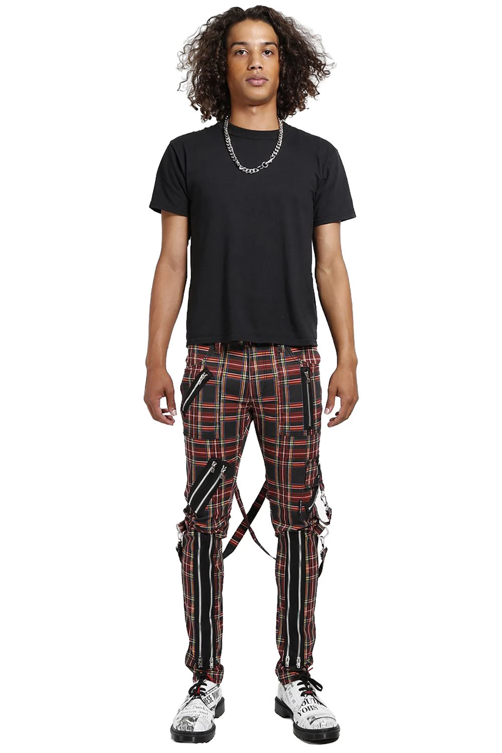 These red plaid pants are bad to the bone! Haunt the streets in these punk pants complete with contrast strips, zipper details, and D-ring hardware. Zip up the pant legs for a change in fit—remove the bondage straps for a lax look. Made of high-quality cotton, these slim pants are constructed to keep you comfy & cool all the dangerous dayz of yer life.