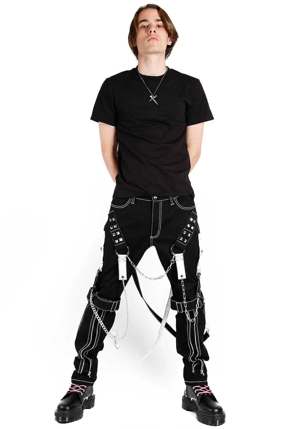 Make a statement in these black bondage pants, featurin’ silver o-rings, metal chains, and pyramid cone studs. You’re the ghost with the most in the wicked white contrast strips, bondage straps, and accent buckles around the knees. The pant legs can be zipped for a change in style, topped off with a zippered closure for a cool + comfy fit.Â