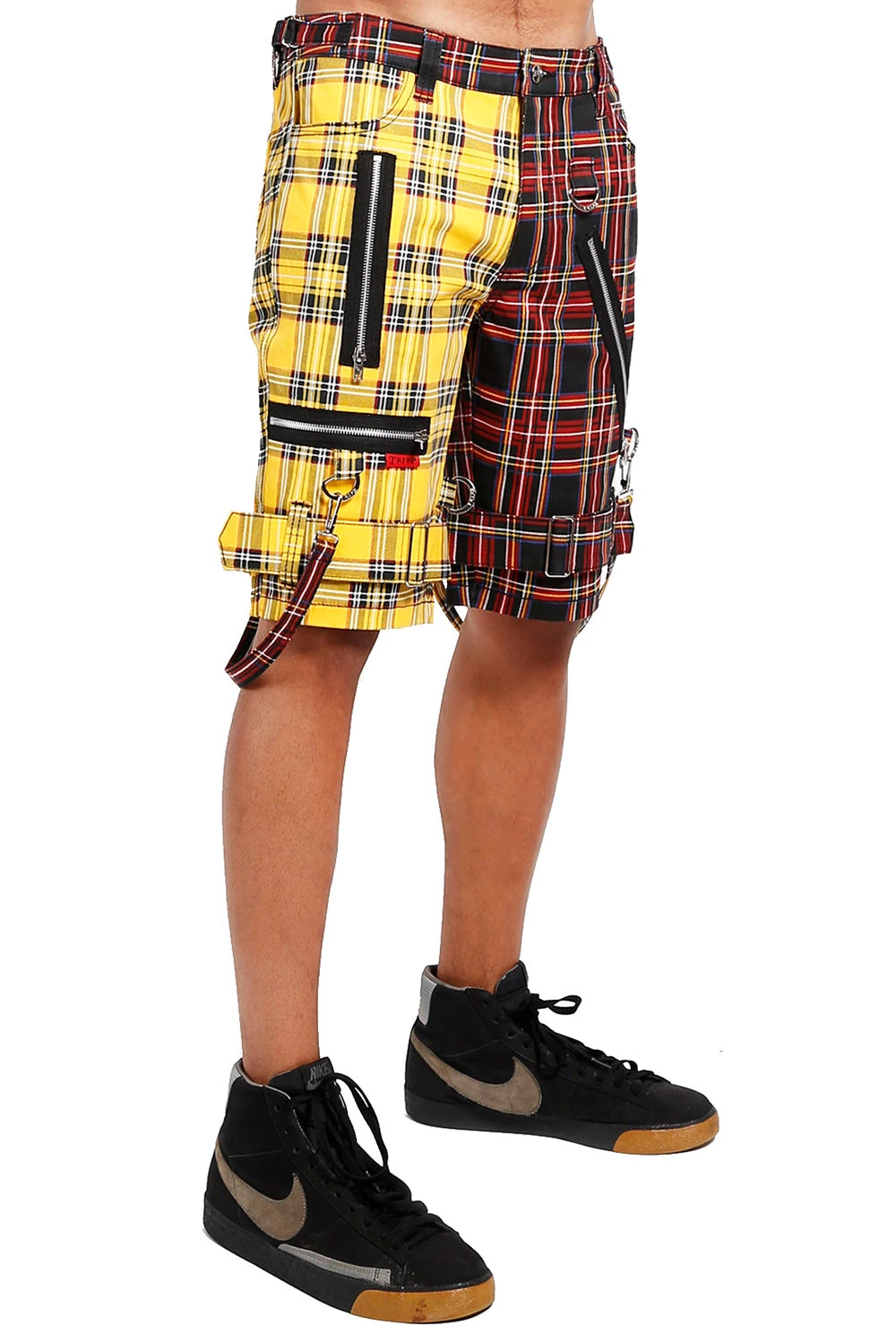 Bring the summer heat in these hella hot bondage shorts! Punked-out with split leg construction, these sikk shorts feature black contrast strips, accent zippers, and adjustable straps across the knees. Half yellow half black plaid, these Tripp shorts are complete with removable bondage straps and D-ring hardware.Â