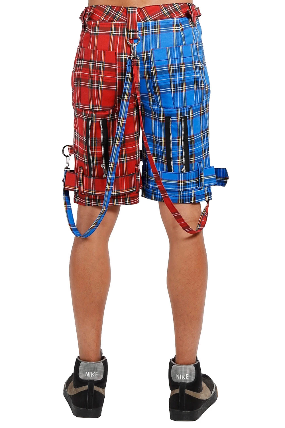 Make a statement in these hella sick bondage shorts! Punked-out with split leg construction, these plaid shorts feature black contrast strips, accent zippers, and adjustable straps across the knees. Half red half blue, these Tripp shorts are complete with removable bondage straps and D-ring hardware.Â