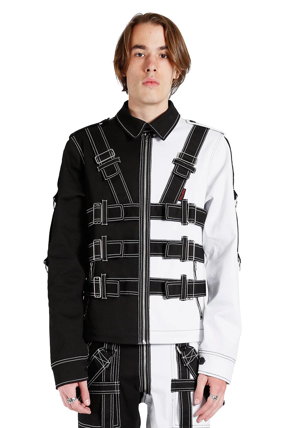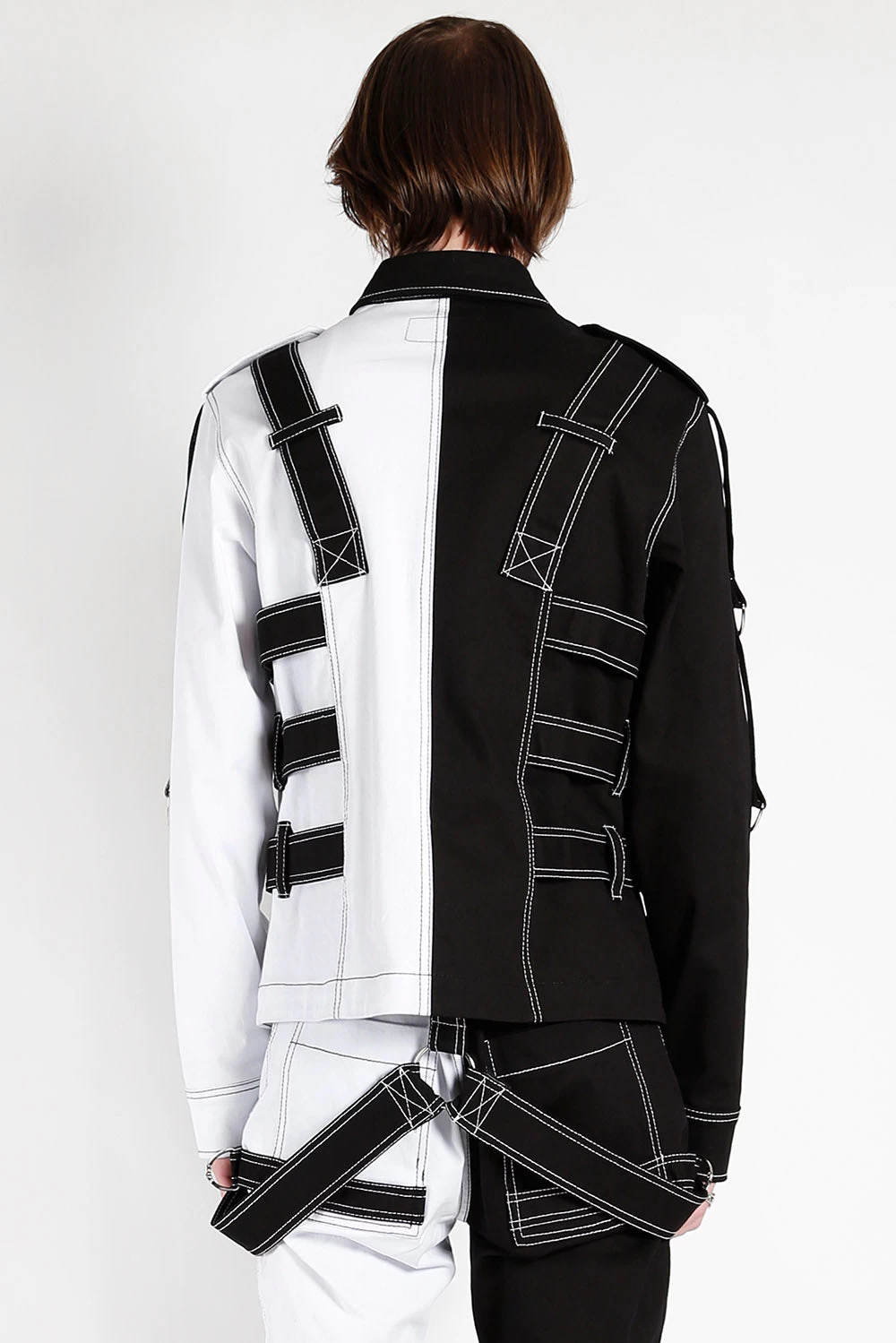 You keep it criminally cool in this rad rave jacket, complete with accent straps and buckles all over. Half black and half white, this goth jacket is constructed to flatter your figure with its trim + tailored design. Zip it up all the way or show some skin—the choice is yours!