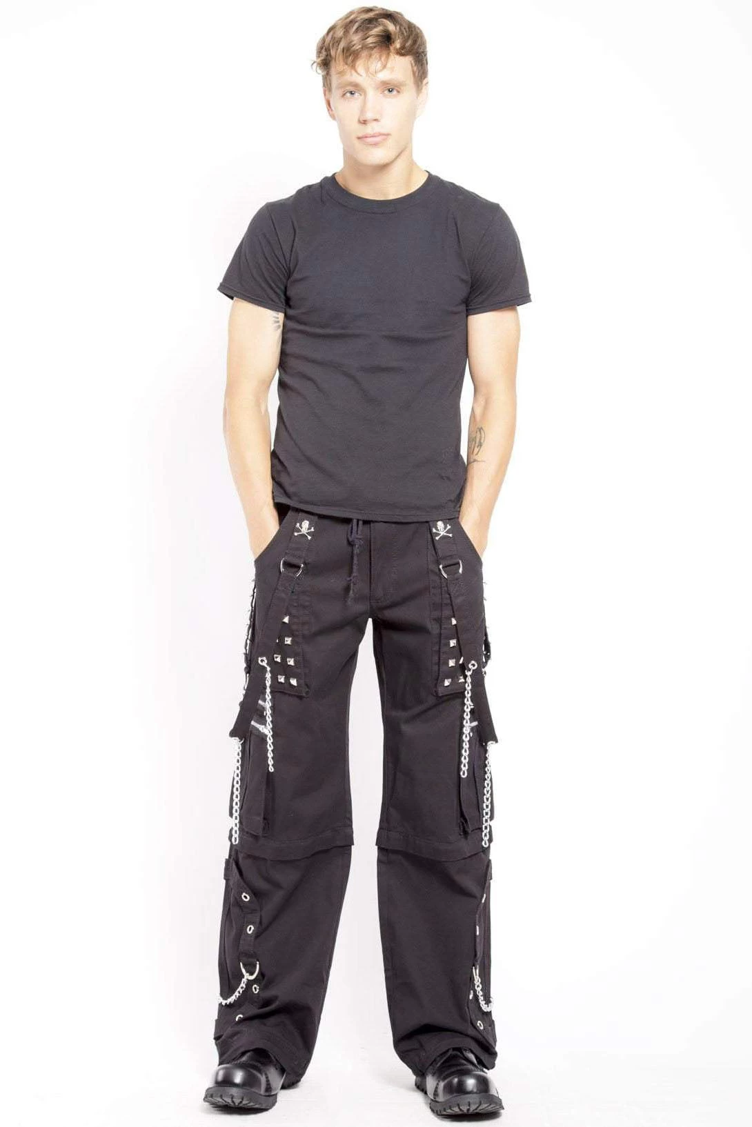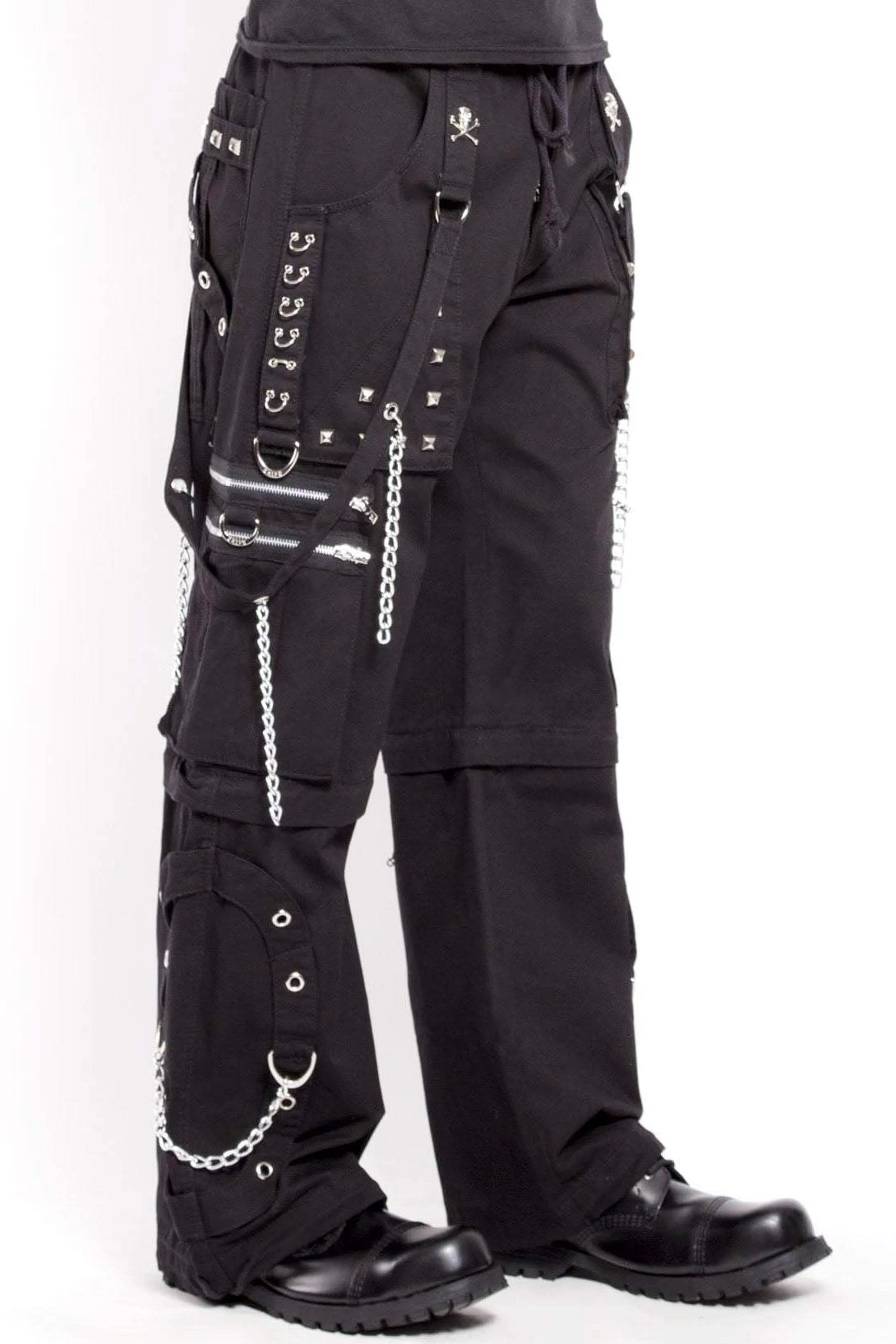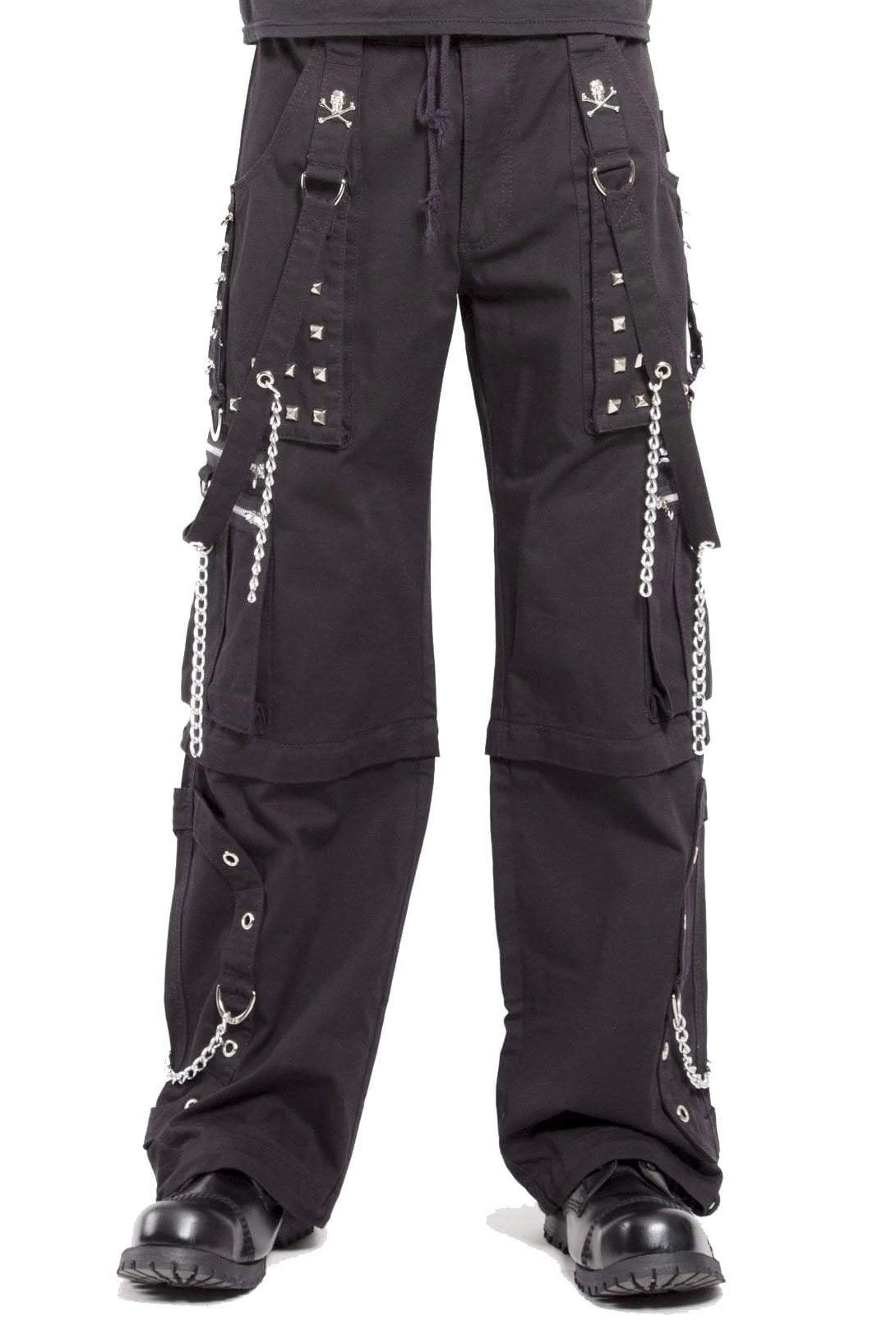 A prisoner of the night, you escaped the chain gang in these hella cool cargo pants. With hardware and chains all over, these Tripp NYC pants are insanely comfy and unique. With D-rings, chains, and pyramid studs, these gothic pants demand command. Skulls & crossbones are stitched on the bondage straps for an exxtra dash of death. From pants to shorts, you have the power! Zip off the bottoms to transform these Tripp pants into Tripp shorts!Â