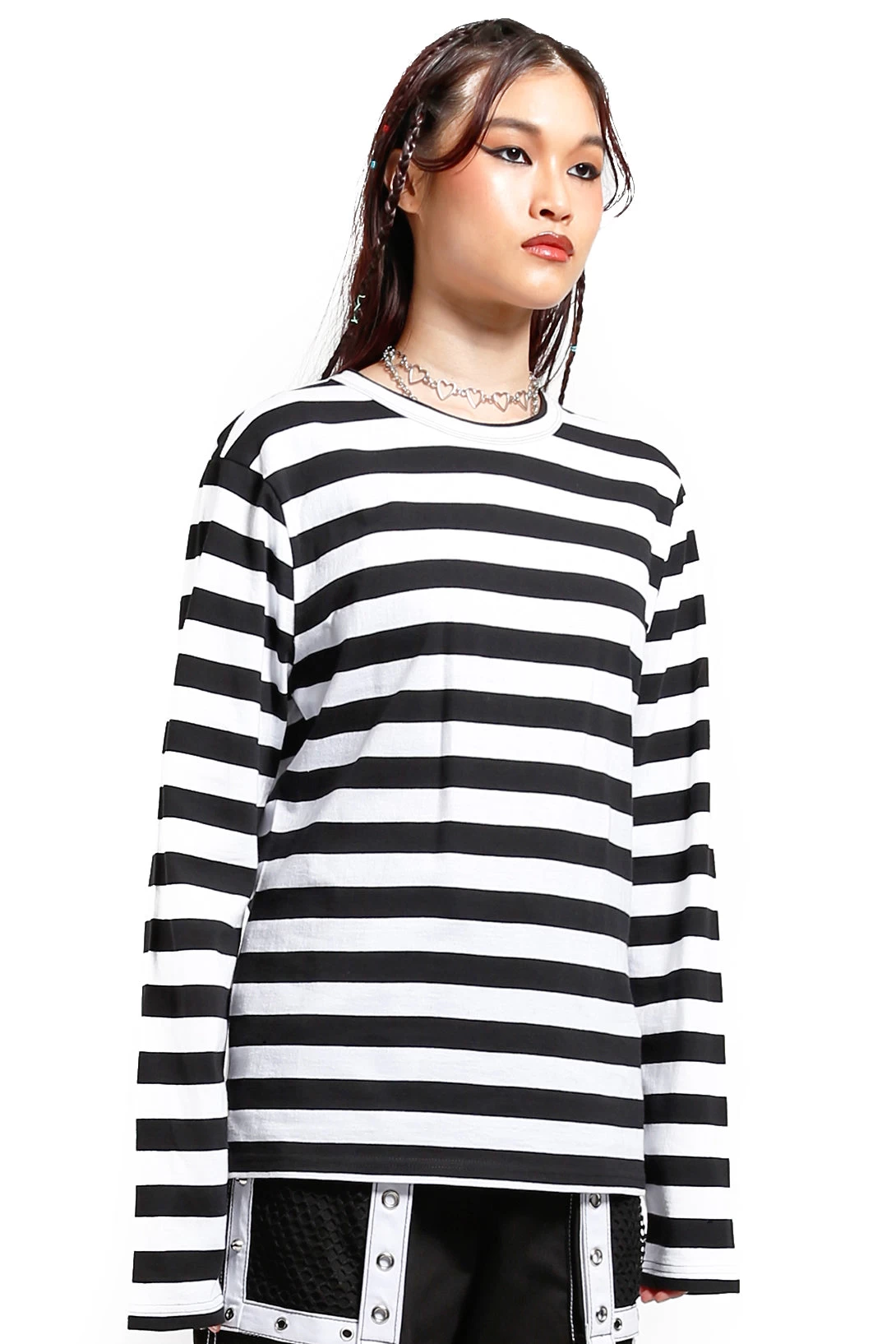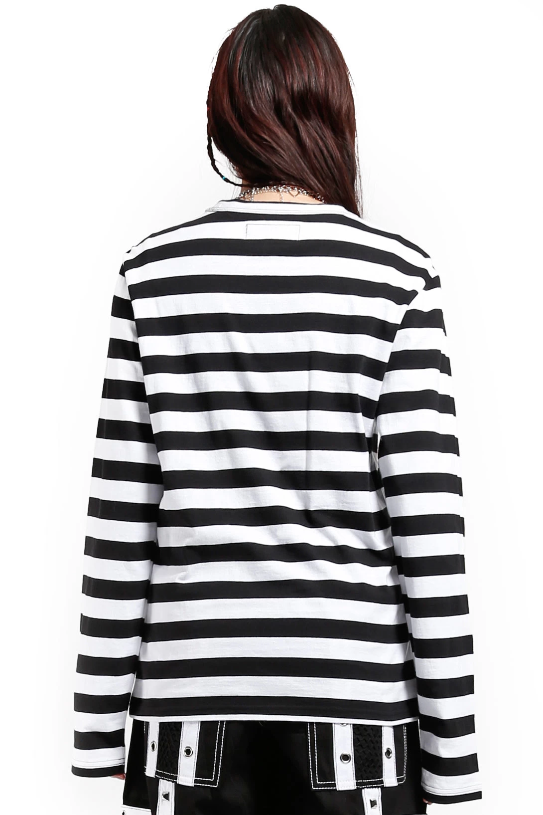 Invoke some emo with this signature striped shirt—an essential in every goth boy and ghoul’s closet! Made of high-quality cotton, this long sleeve tee features black and white stripes, a flattering fit, and super soft construct. Layer it under a band shirt, or rock it on its own… whatever your dark heart desires!