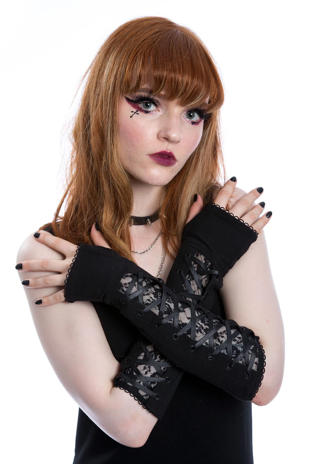 Your darkness is divine, darkling! Protect your arms from the elements in these beautiful corset arm warmers. Summon sexy spooks with the peek-a-boo lace details and ribbon lacing, made for the punk princesses and mistress of the macabre!