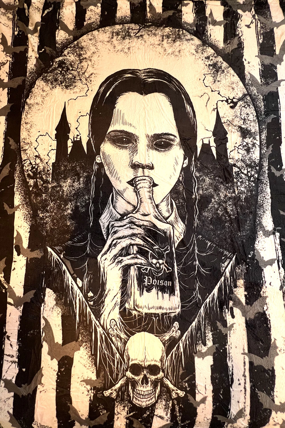 Turn your home into a haunted house with this wicked cozy Wednesday Addams blanket! Sinfully soft, this gravely goth blanket features Wednesday sipping a bottle of poison outside her family mansion under the fog of a full moon. A skull and crossbones finish her chilling cameo, with beastly back eyes and a monstrous taloned hand. Perfect for creeping out your couch, bed, or coffin!