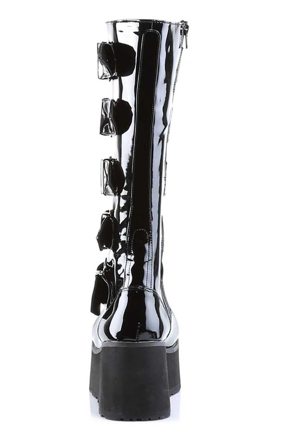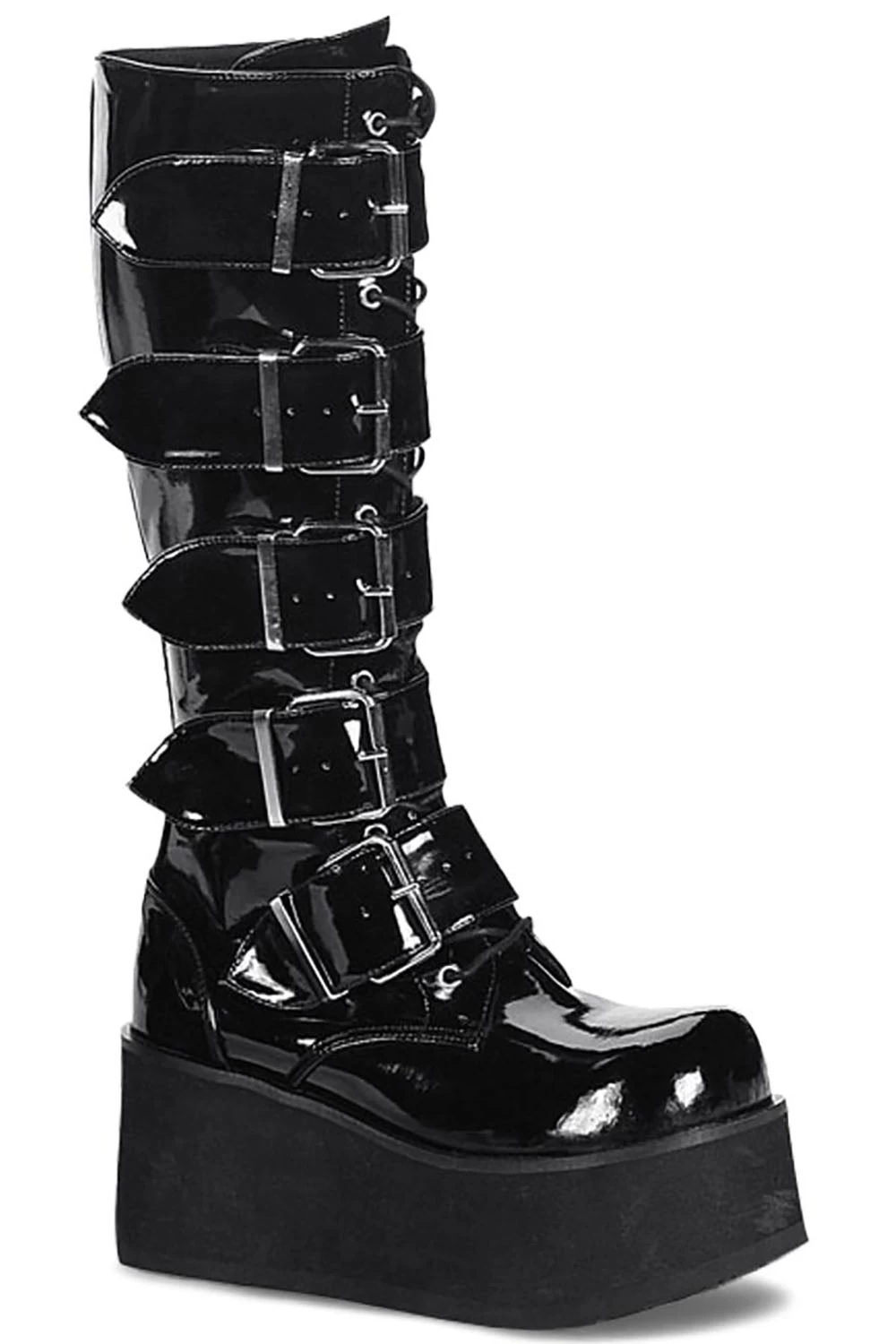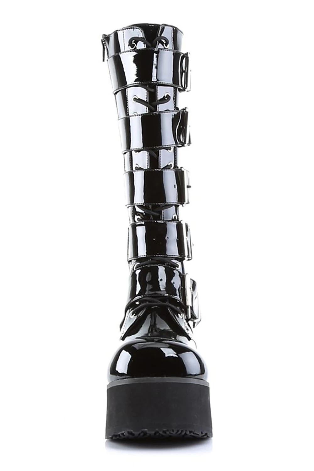 Own the night in these dark Demonia boots, made for monsters and men. Glow under starlight in the shiny black patent construct. Possessed with 5 silver buckles and lace-up details, these knee-high boots are complete with a 3 1/4″ platform to give your badness a boost. Made of quality vegan leather cause creepy cow lives matter!Â
